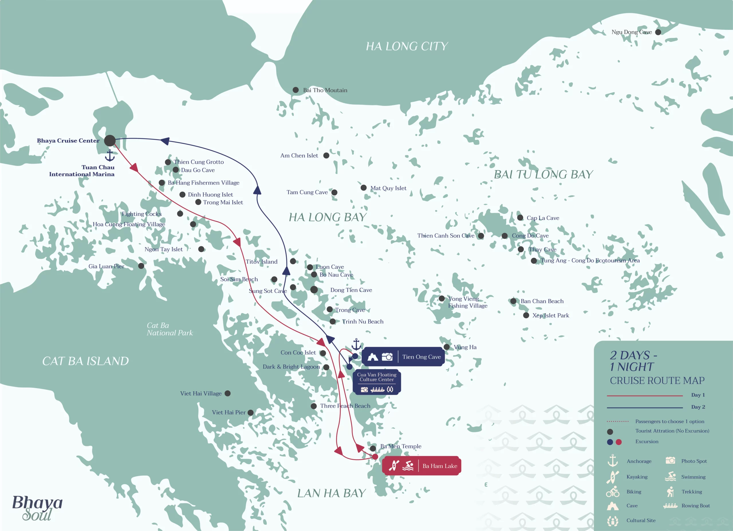 Bhaya Soul’s itinerary is designed by Route 3 through Halong Bay and Lan Ha Bay. This route stands out for its quieter, more enriching journey. Ideal for travellers seeking a slower pace, it combines stunning landscapes with cultural depth -away from the busier cruise paths.